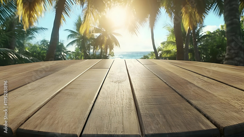tropical beach, wooden table, background, illustration, summer, ocean, palm tree, sunny, vacation, paradise, relaxation, calmness, nature, scenic, escape, holiday, travel, warmth, sunshine, tropical, coastal, idylli, serene, calm, peaceful, get-away, resort, sea, sand, sky, cloud, sun, bright, light, texture, wood, plank, design, image, graphic, template, element, photo, visual, composition, artistic, vibrant