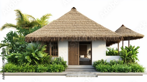 Tropical bungalow with thatched roof and lush greenery on a white background