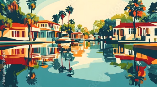 canal, house, water, tropical, palm, tree, boat, waterfront, villa, architecture, sunlight, sky, landscape, scenery, vibrant, colours, art, illustration, design, style, summer, vacation, peaceful, serene, calm, tranquil, idylli, paradise, luxury, elegance, exotic, beauty, nature, greenery, teal, orange, red, yellow, green, blue, building, home