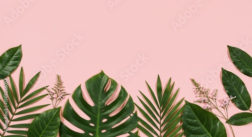 Tropical green leaves flat lay on pastel pink background focus stacked botanical scene with vivid detail elegant shadows and central clean space for text or logo trendy wellness style generative ai