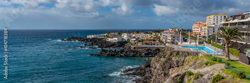 Tropical island of Tenerife. Panorama of the Coastline with buildings with a pool
