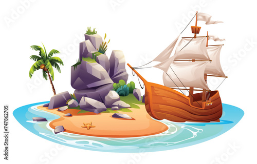 Tropical island with wooden sailing ship, palm tree and rocks. Vector cartoon illustration isolated on white background
