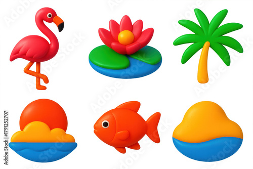 Tropical Lagoon Icons. 3D icon set of tropical lagoon scene: flamingo, water lily, palm leaf, sunset, small fish, sandy shore. A