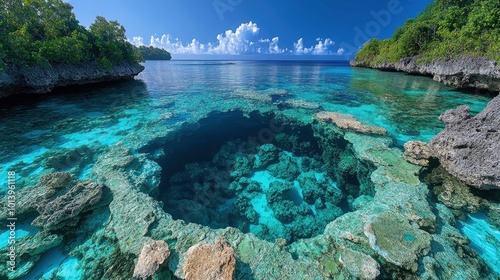 lagoon, tropical, turquoise, blue, water, coral, reef, ocean, sea, island, shore, coast, beach, rock, cliff, palm tree, tree, foliage, vegetation, sky, cloud, sun, sunlight, natural, scenic, beautiful, paradise, exotic, vacation, travel, destination, holiday, get-away, relax, tranquil, serene, peaceful, calm, underwater, marine life, ecosystem, nature, conservation, environment, sustainability