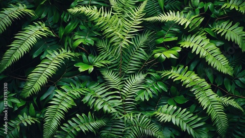 Tropical leaves texture background with green ferns ideal for website banners, wallpapers, and advertising space. Nature-inspired design.