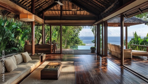 Tropical living room with ocean view.