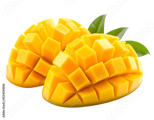 Tropical Mango Delight: Captivating image showcasing two ripe, succulent mangoes artfully sliced and presented with vibrant, fresh green leaves, perfectly capturing the essence of summer.