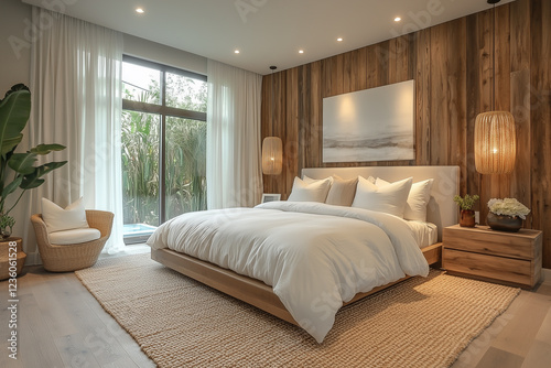 interior, minimal, design, bedchamber, tropical, modern, contemporary, bed, bedding, white, cream, beige, wood, wooden, natural, paneling, wall, window, curtain, sheer, rattan, wicker, chair, pendant, lighting, artwork, seascape, frame, pillow, duvet, comfortable, plant, greenery, palm, neutral, clean, simple, minimalistic, room, decor, peaceful, zen, resort, furniture, flooring, hardwood, rug, jute, residential, indoor