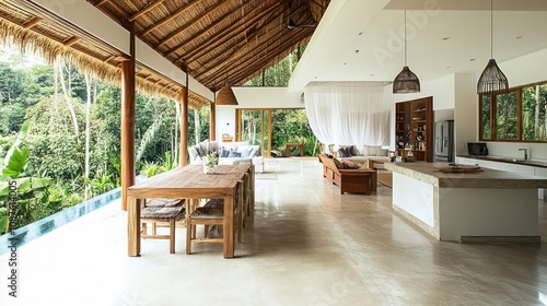 home, interior, design, tropical, modern, jungle, view, house, architecture, living, room, kitchen, dining, table, chair, wooden, furniture, concrete, floor, ceiling, thatched, roof, window, glasses, wall, white, light, roomy, airy, plant, greenery, nature, pool, forever, minimalist, style, luxurious, comfortable, relaxation, peaceful, serenity, escape, resort, villa, open, concept, bright, sunlight