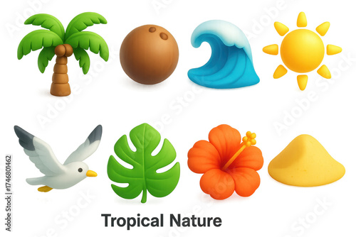 Tropical nature icons: palm tree, coconut, wave, sun, bird, leaf, flower, sand