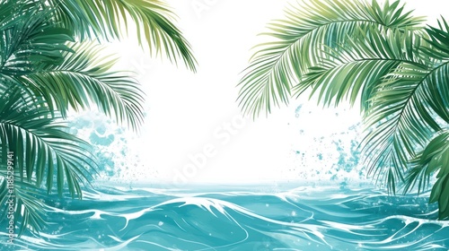ocean, wave, water, splash, sea, palm, leaf, tropical, summer, beach, coast, vacation, holiday, travel, paradise, green, nature, blue, turquoise, white, background, design, illustration, scene, landscape, texture, pattern, element, graphic, isolated, clipping, path, image, photo, photo, art, artwork, digital, vector, template