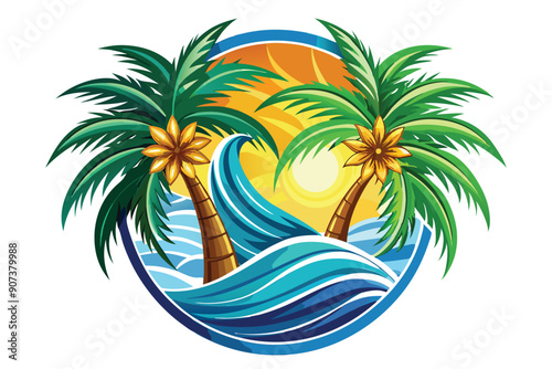 palm, tree, tropical, blue, wave, sun, setting, sunset, ocean, sea, sky, beach, summer, vacation, travel, paradise, relax, nature, green, yellow, orange, brown, white, illustration, cartoon, graphic, art, design, digital, vibrant, bright, colourful