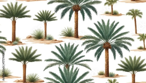 Tropical Palm Trees Pattern on a White Background Featuring Lush Green Foliage and Desert Elements