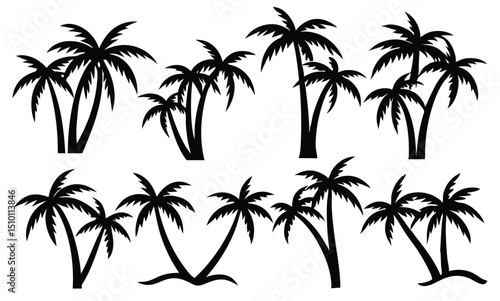 palm tree, tropical, silhouette, black-and-white, illustration, graphic, design element, summer, vacation, beach, paradise, nature, clip art, vector, isolated, symbol, icon, leaf, coconut, exotic, greenery, flora, ocean, holiday, travel, artwork, set, collection