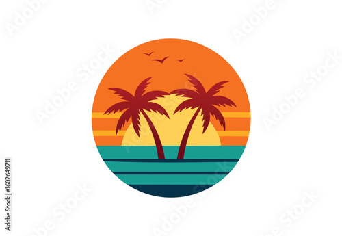 tropical, sunset, palm tree, silhouette, ocean, bird, vector, illustration, circle, orange, yellow, blue, vacation, paradise, travel, tropical island, beach, summer, sunrise, peaceful, serene, relaxing, holiday, nature, coast, sky
