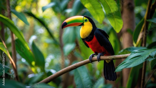 Tropical rainforest scene featuring a colorful toucan perched on a branch amidst lush green foliage.