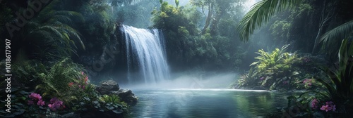 fantasy, waterfall, jungle, mist, foliage, vibrant, serene, pool, lush, nature, landscape, tropical, enchanting, magical, dreamlike, greenery, exotic, paradise, calmness, mystical, adventure, wilderness, scenic, peaceful, flora, fauna, idylli, imaginative, aethereal, wonderland, captivating