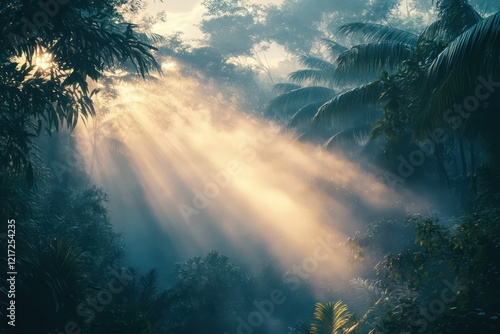 Tropical rainforest with mist rising from the canopy at dawn, the scene mysterious and filled with the sounds of waking wildlife