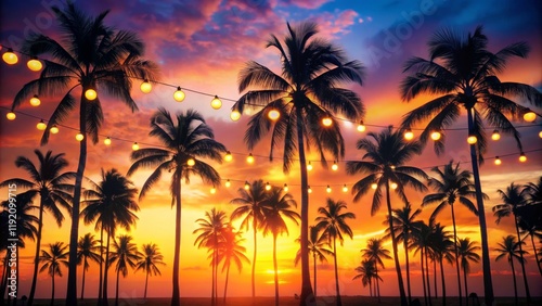 Tropical Sunset Silhouette Palm Trees, String Lights, Vibrant Sky, Sunset Photography Tropical, Palm Trees