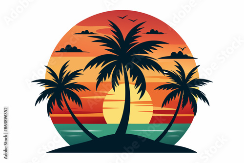 Tropical sunset with palm trees vector illustration, Retro and vintage summer vibes t-shirt design with palm tree