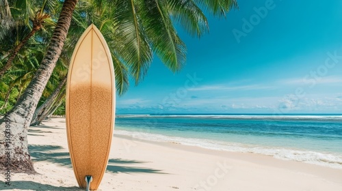 Tropical Surfboard on Beach Longboard under Palm Trees