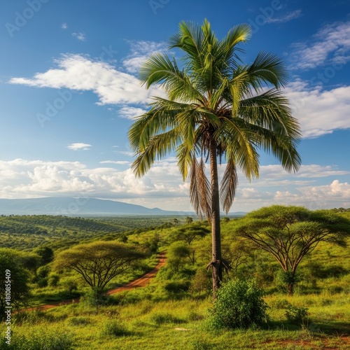 Tropical tranquility scenic view lush landscape palm tree on expansive African savanna horizon