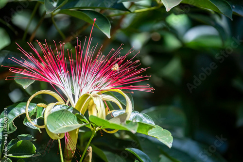 tropical tree with pink flowers and exotic fruits