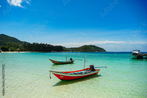 Tropical vacation destination. Mountains, turquoise sea and luxury resorts on the coast of the island. Small palm tree and beautiful calm lagoon on Malibu Beach, Koh Phangan, Thailand.