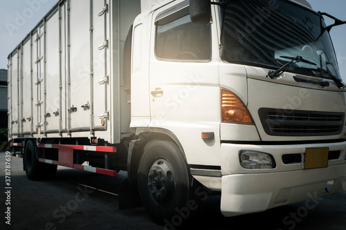 Truck cargo container on parking. Cargo freight, Shipment, Delivery service. Logistics and transportation.