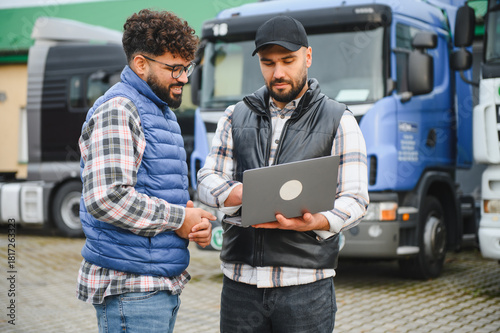 Truck drivers discussing logistics planning using laptop