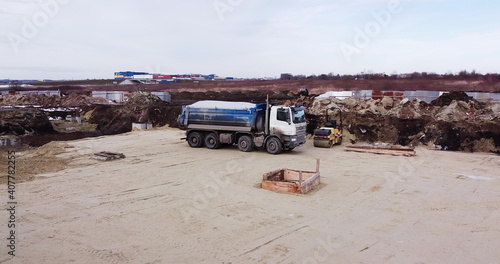 Truck laden with dirt and soil travels in a road construction complex site. Dump truck unloading soil or sand at construction site