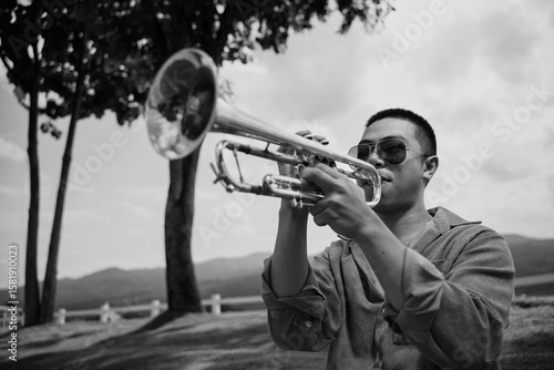 musician, trumpet, music, harmony, jazz, monochrome, artist, nature, entertainment, man, playing, horn, player, person, classical, blowing, sound, event, park, wind, outdoors, urban, live, solo, performance, tune, melody, creativity, hobby, calm, talent, leisure, lifestyle, freedom, expression, practice, enjoyment, note, relaxing, inspiration, open air, activity, tone, passion, black, white, skill, emotion, storytelling