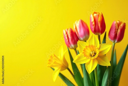 Tulips and daffodils against a bright yellow sky, bunch, bouquet, daffodil