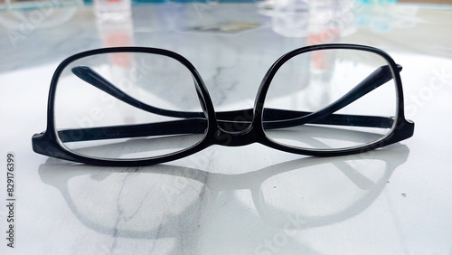 Tulungagung, Indonesia May 26, 2026: classic black-framed glasses for nearsightedness, lying on a white table.