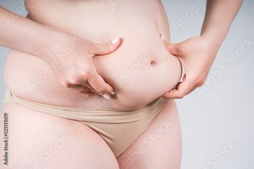 Tummy tuck, flabby skin on a fat belly, plastic surgery concept
