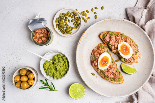 Tuna toast. Open sandwiches with whole grain bread, canned tuna, boiled egg, avocado and olives on white background. Healthy breakfast food, top view