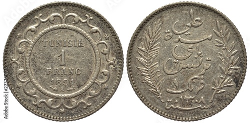 Tunisia Tunisian coin 1 one franc 1891, French Protectorate, ruler Muhammad al-Sadiq Bey, value and date within ornamented circle country name, value and date in Arabic, sprigs flank