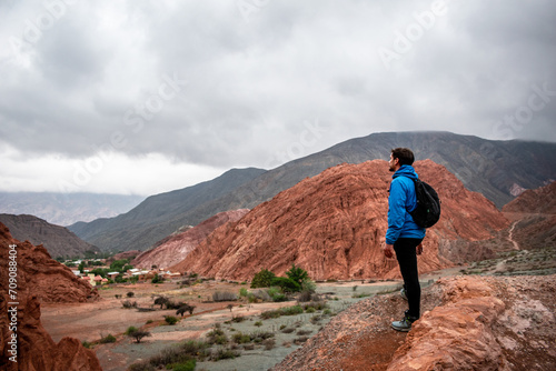 Turista parado en mirador de montaña en las cercanías de Purmamarca, Provincia de Jujuy