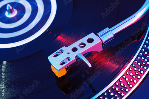 Turntable vinyl record player. Sound technology for DJ to mix & play music. Red vinyl record. Label. Bright party red and blue lights illuminate the surface of the plate. Stylus with needle