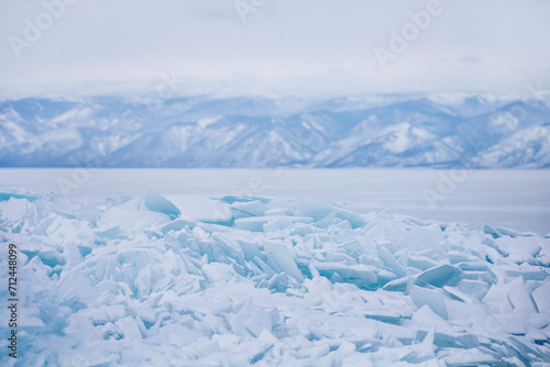 Turquoise ice floe. Ice-drift of Baikal lake, Winter landscape.