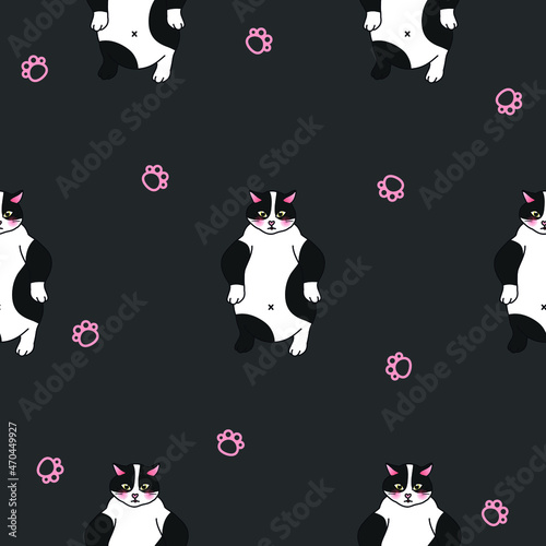 Tuxedo Cat and Pink Paws Seamless on Dark Gray Background