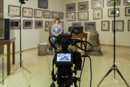 TV shooting at the Museum. LCD monitor on the camcorder. The girl in front of the camera. A record of the interview. Filming equipment and lighting equipment.