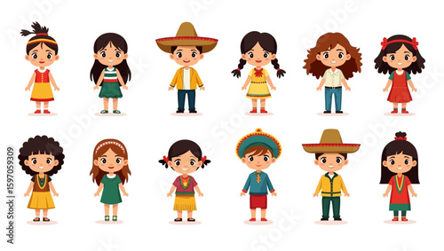 children, cartoon, art, diverse, traditional, attire, ethnic, cultural, costume, dress, shirt, hat, sombrero, braid, hair, colours, bright, smiling, cute, cheerful, happy, joyous, festive, celebration, heritage, nationality, country, group, collection, variety, style, design, flat, vector, illustration, isolated, graphic, display, education, smile, portrait, young, face, person, fun, clothes, children