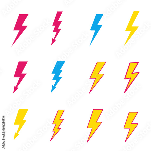 lightning, bolt, icon, electric, energy, power, flash, speed, electricity, symbol, graphic, design, vibrant, pink, yellow, blue, colours, collection, set, illustration, bright, sharp, pointed, arrow, danger, warning, alert, quick, fast, intense, dynamic, powerful, force, strike, thunder, storm, voltage, current, charge, zap, shock, impact, impulse, spark, nature
