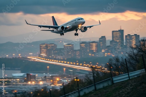 Twilight Airplane in Flight with Blurred Cityscape – Ideal for Travel, Aviation, or Business Themes.
