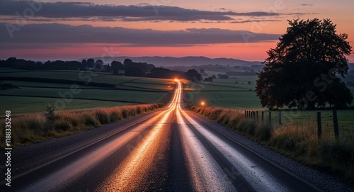 twilight, glow, country, road, highway, sky, landscape, asphalt, sunset, travel, nature, horizon, car, speed, way, rural, cloud, cloud, sun, transport, empty, route, journey, drive, traffic, field, driving