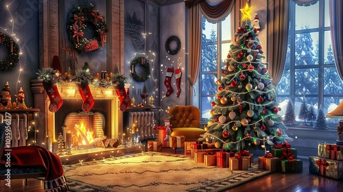 Twinkling Christmas Festivity: Table Adorned with Fairy Lights, Holiday Ornaments, and Nativity Scene Centerpiece, Bathed in Warm Inviting Glow