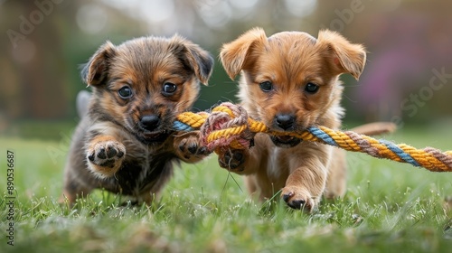 Two adorable brown puppies are playing tug of war with a colorful rope toy in a grassy field