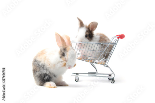 Two adorable fluffy rabbits with shopping cart on white background, cute bunny pet animal on sell concept