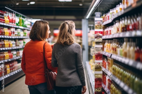 Two adult women comparing products in market